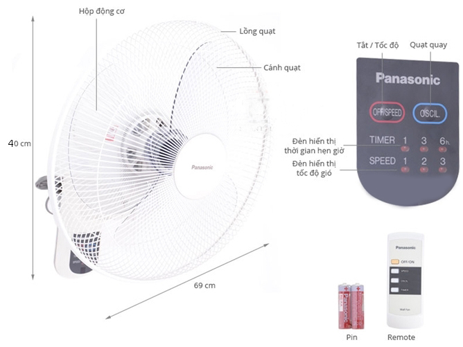 Quạt treo tường Panasonic F-409M trang bị điều khiển từ xa, làm mát hiện đại.